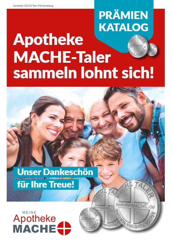 Sammeln Sie bei Ihrem Einkauf unsere MACHE-Taler und profitieren Sie von attraktiven Prämien. Ihre gesammelten Taler können Sie in unseren Apotheken vor Ort gegen Prämien eintauschen. Alle Taler-Prämien finden Sie in unseren Prämienkatalogen.